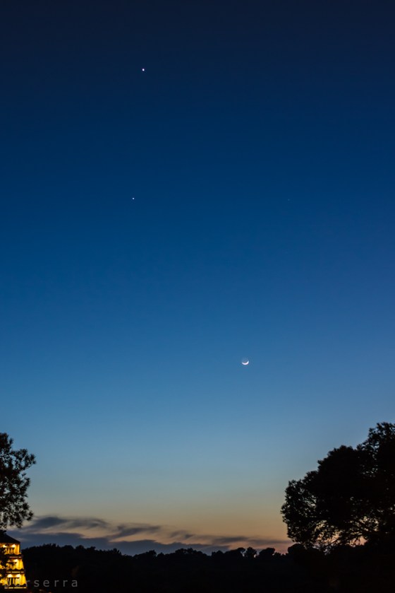 La conjunción de Venus y Júpiter en el firmamento alcanzó estos días su punto más cercano. Este acontecimiento se produce cuando ambos planetas, en su movimiento a través de sus respectivas órbitas, se sitúan apenas a tres grados de distancia, quedando entre ambos apenas una distancia de unos 724 millones de kilómetros. Para verlos no hace falta telescopio tan solo hay que mirar hacia el oeste poco después de la puesta de Sol. Ademas los días 25 y 26 de marzo, pudimos ver como la Luna se unía a los dos planetas para darnos un hermoso espectáculo: