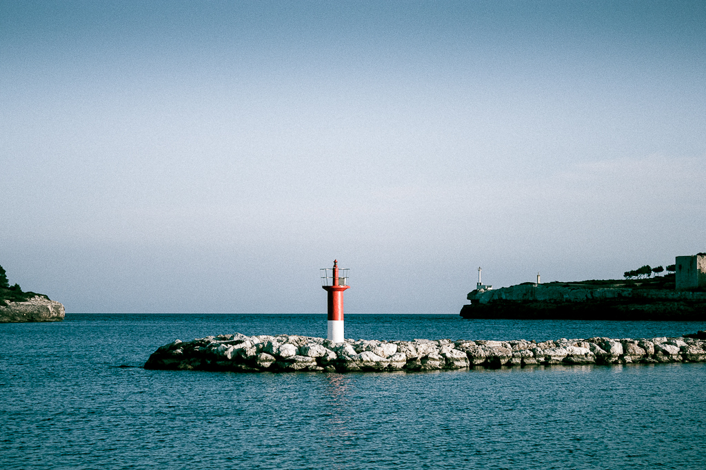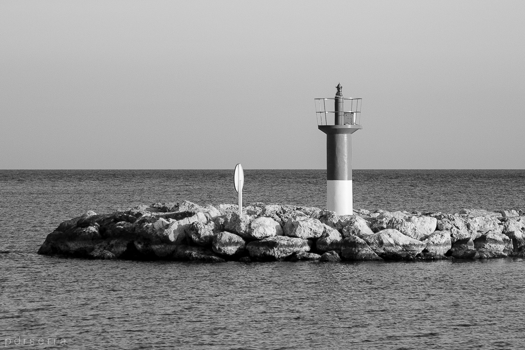 En primer plano la baliza en la entrada del puerto, y al fondo a la derecha el pequeño faro de Portopetro