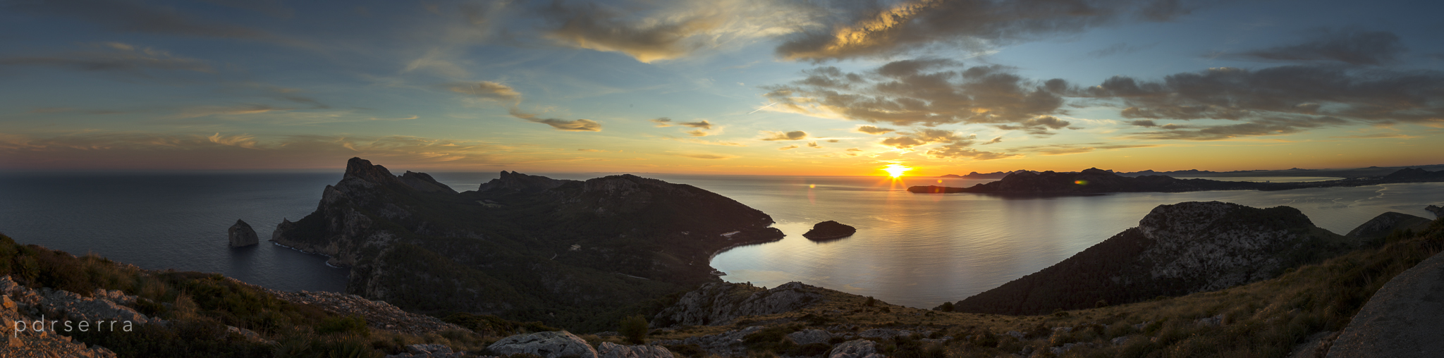 Desde lo alto de Sa Talaia d’Albercutx, se puede divisar de izquierda a derecha: S’Illot d’es Colomer, la península de Formentor, s’illa de Formentor, la bahía de Pollença y al fondo es Mal-Pas y mas allá, el sol saliendo por la Península de Llevant.